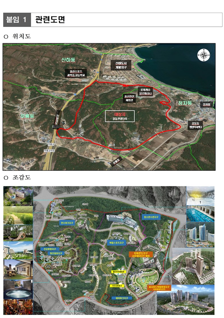 강동관광단지 일원에서는 현재 강동 롯데리조트와 제이에스 에이치(JS H)호텔&리조트 건립이 진행되고 있으며 공공파크골프장 조성도 추진 중이다. 울산시는 향후 민자 유치 등 원활한 사업 추진을 위해 「부동산 거래신고 등에 관한 법률」 제10조 규정에 따라 1년간 토지거래허가구역으로 재지정했다.