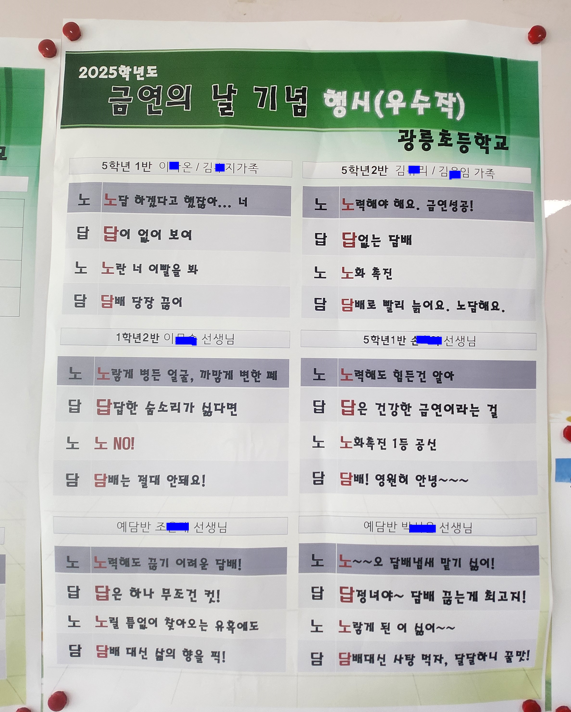 이번 캠페인에서는 가정과 연계한 참여 프로그램도 함께 진행되었다. ‘가족과 함께하는 금연 행시 짓기 공모전’은 학생과 가족이 함께 금연을 주제로 삼행시 또는 사행시를 작성하여 5월 23일까지 보건실 앞 응모함에 제출하는 방식으로 운영되었으며, 큰 호응을 얻었다.