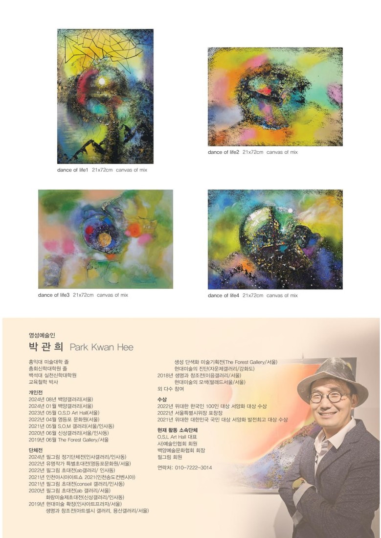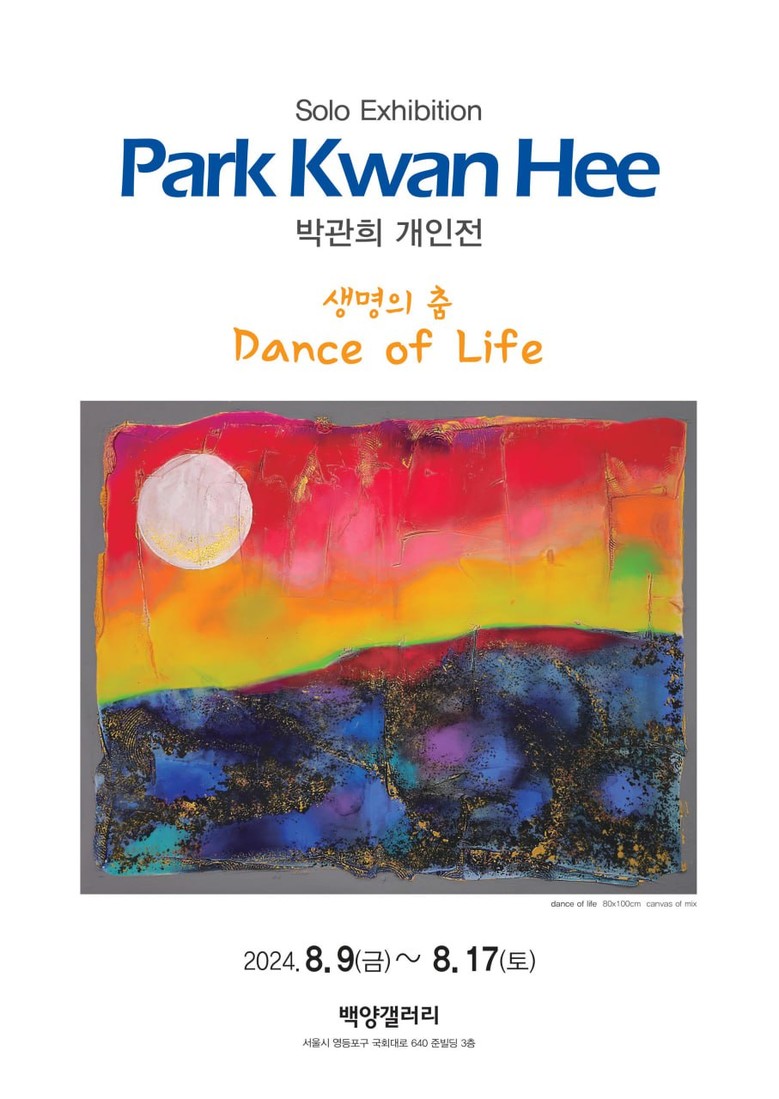 서울 영등포구 국회대로 640 준빌딩 3층 백양갤러리에서 2024년 8월 9일부터 17일까지 박관희 화백의 개인전 '생명의 춤 Dance of Life'가 열린다. 이번 전시는 인간의 삶과 생명의 경이로움을 동양화적 회화와 판타스틱한 색채로 표현한 박관희 작가의 작품들을 선보인다.