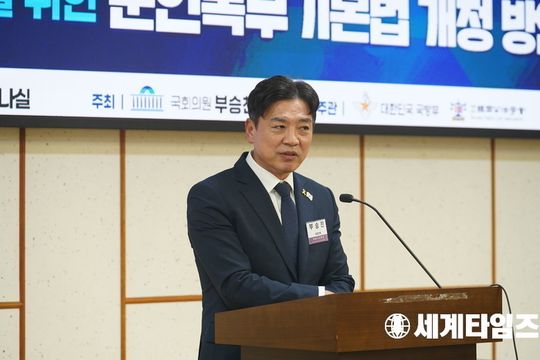 '부승찬' 더불어민주당 의원이 22일 오후 서울 여의도 국회 의원회관 세미나실에서 열린 군인복무기본법 개정 토론회에서 개회사를 하고 있다.