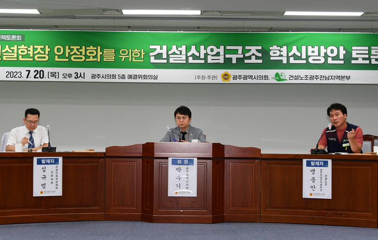 광주시의회 산업건설위원회 위원인 박수기 의원이 좌장을 맡은 이날 토론회는 건설근로자공제회 전문위원인 심규범 박사가 “적정임금제 도입을 통한 건설산업 구조개선” 주제의 발표에 이어 강성진 ㈜청송건설 대표이사가 간접노무비의 공사비 반영의 필요성을, 맹종안 전국건설노조 광주전남지역본부장이 건설현장의 고용 안정 개선방안을 제안하는 순서로 진행됐다.