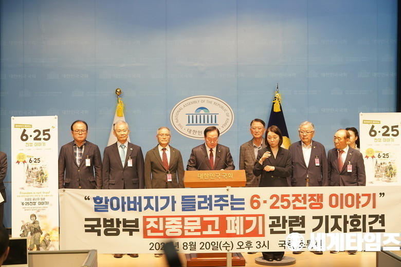 '한기호' 국민의힘 의원이 20일 오후 국회 소통관에서 기자회견을 갖고 국방부의 '진중문고' 폐기 결정 관련 기자회견을 갖고 있다.