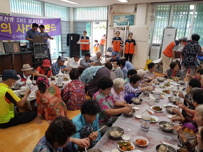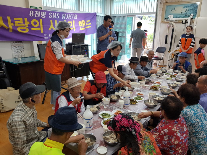 [대전=세계타임즈 이장성 기자] 대전시 소외계층을 위해서 다양한 봉사활동을 실천하고 있는 대전시 SNS 8천명 봉사단체 사단법인 사랑의 사다리 밴드(리더 이정제)는 27일, 오전9시~오후2시, 동구 세천동 식장산 입구에 위치한 삼곡경로당에서 삼계탕 및 위문공연 봉사로 사회적 효행을 실천 하였다.