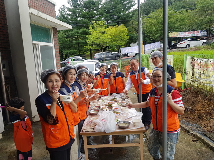 이날 봉사에는 비오는 날씨에도 신상일, 안경헌, 유희자 이사 등을 비롯해서 회원 20명이 참여해서 삼계탕과 위문공연 봉사를 하였다..