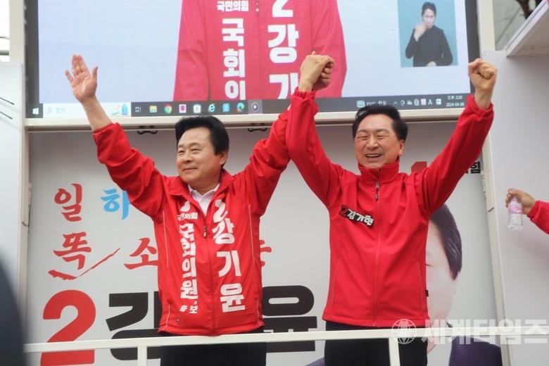 [세계타임즈 = 이판석 기자] 4.10총선이 나흘 앞으로 다가온 가운데 주말 유세전이 한창인 가운데 국민의힘 김기현 전 대표가 6일 오후 창원시 성산구 남양장을 찾아 강기윤 후보에 대한 지원유세를 펼쳤다.