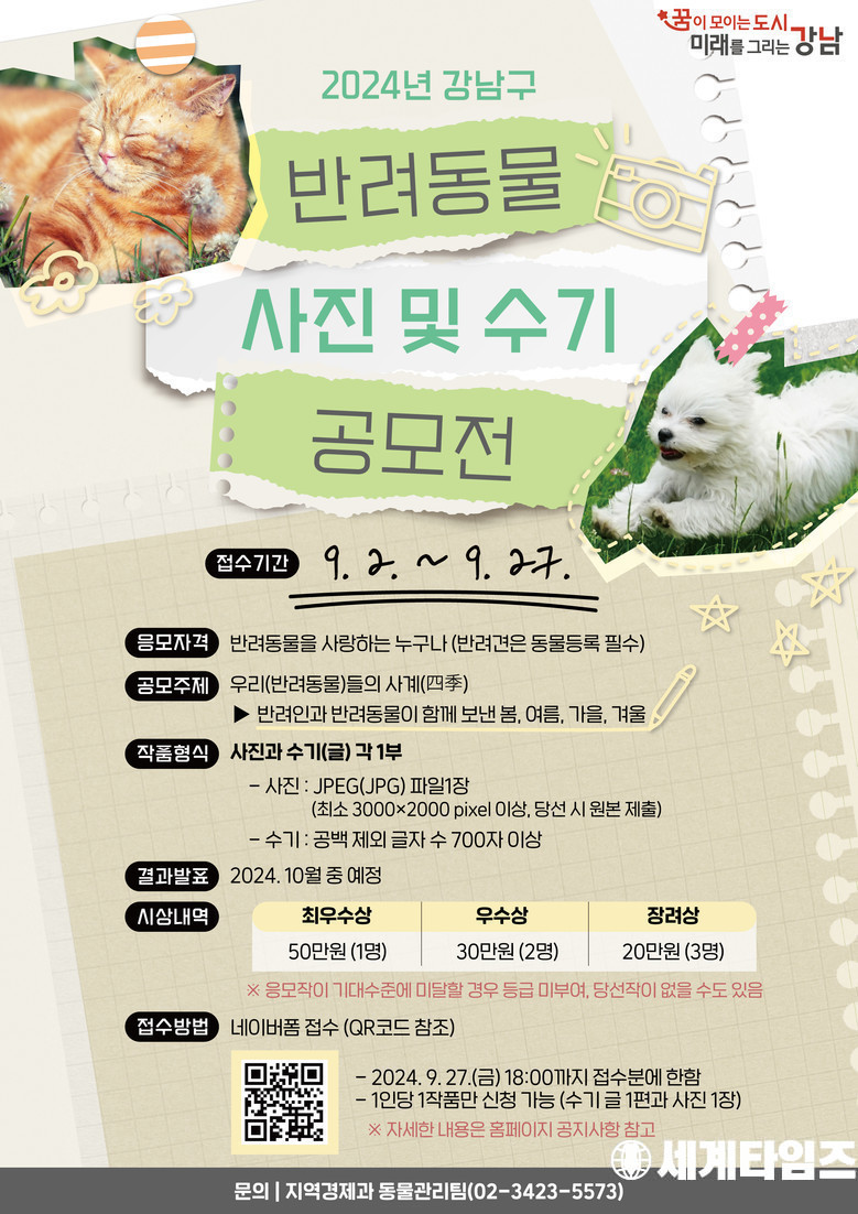 조성명 강남구청장은 “이번 공모전을 통해 반려동물과 함께한 소중한 순간을 나누며 성숙한 반려동물 문화를 확산하는 계기가 되길 바란다”며 “앞으로도 구민들이 반려동물과 더불어 행복한 삶을 누릴 수 있도록 반려동물 친화 정책을 확대해 나가겠다”고 밝혔다.세계타임즈 / 신상철 기자 news@thesegye.com