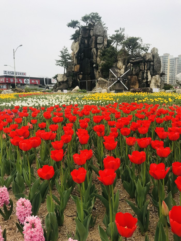 지난해 11월 포천의 추운 겨울을 견딜 수 있는 튤립 구근을 골라 꽃묘 식재 비용의 10분의 1로 조성하였고, 올봄 개화를 시작하여 상춘객의 발길을 모으고 있다.