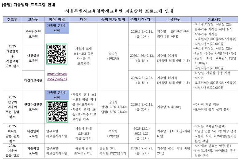 학급·동아리 대상 겨울특색캠프인 「2025 바다를 담은 눈꽃 캠프」는 대천임해교육원에서, 「2026 겨울아 꽁꽁 캠프」는 퇴촌야영교육원에서 운영된다.
