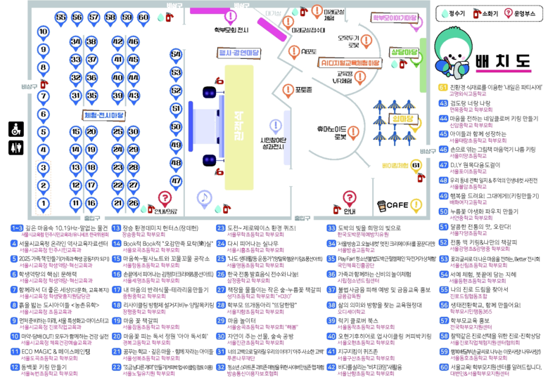 행사는 크게 체험.전시 마당과 상담 마당으로 구성된다. 체험 마당에서는 총 60개 부스가 운영되며, 38개 단위학교 학부모회가 ‘내 마음의 반려식물-테라리움 만들기’, ‘마음 꽃 책갈피 만들기’ 등 다양한 체험 프로그램을 선보인다. 서울시교육청은 학부모 관심사항인 ‘농촌유학’, ‘문해력.수리력 진단' 안내 부스 12개를, 외부 기관은 ‘청소년 불법도박 예방교육’, ‘사이버 안심존 이용’ 등 10개 부스를 운영한다.