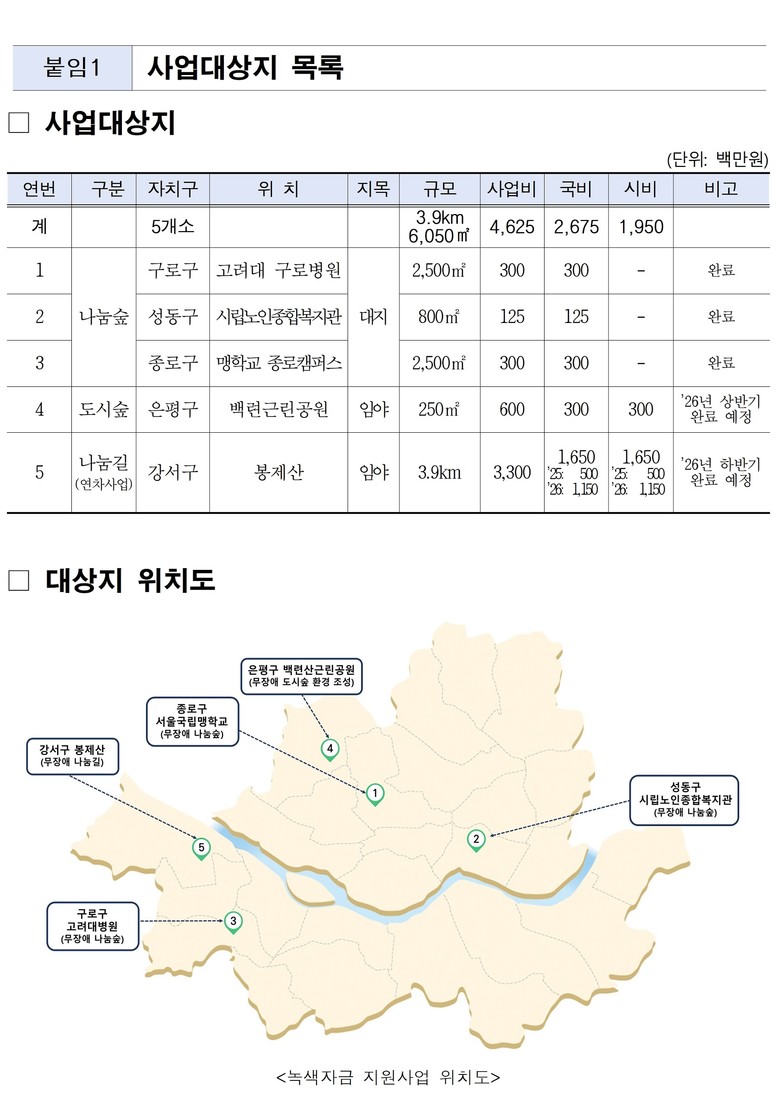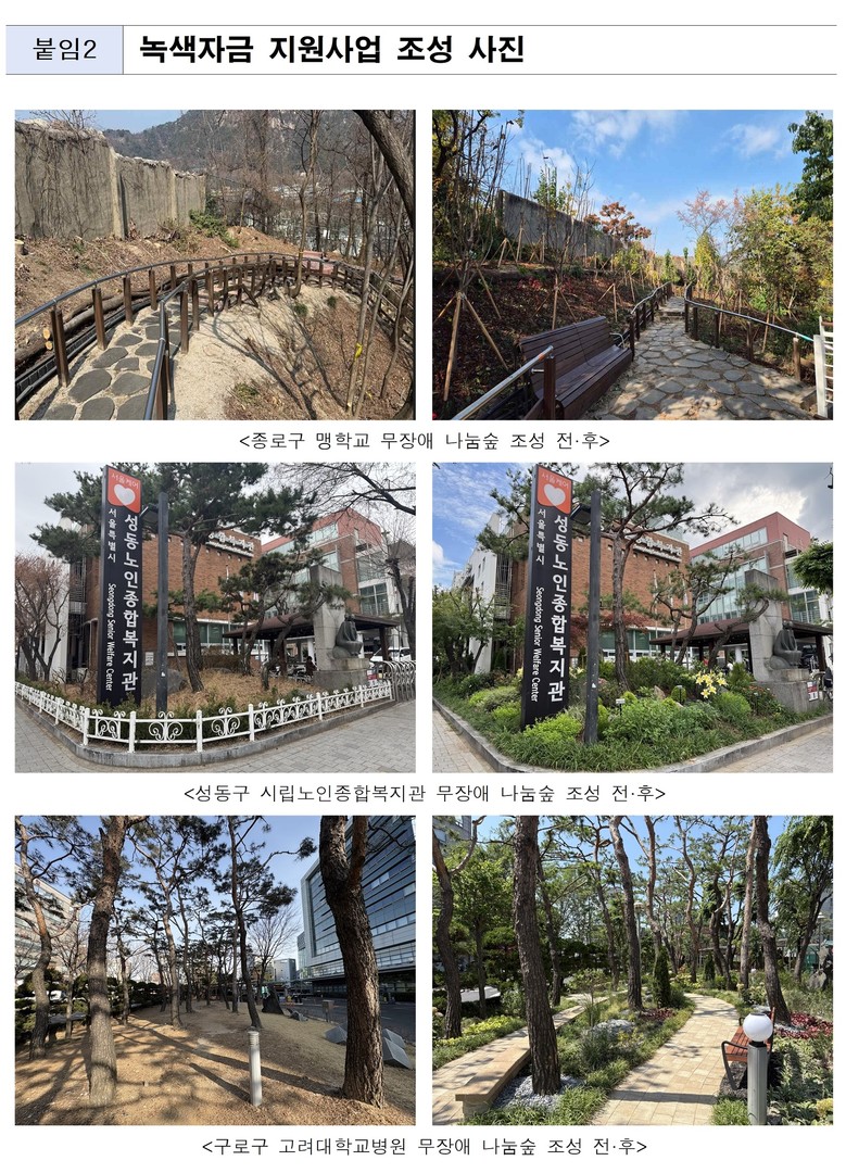 한편 서울시는 동행가든 조성은 물론 기존 공원들의 접근성 개선을 위한 ‘나눔길’, ‘도시숲 환경 조성’도 함께 진행 중이다.