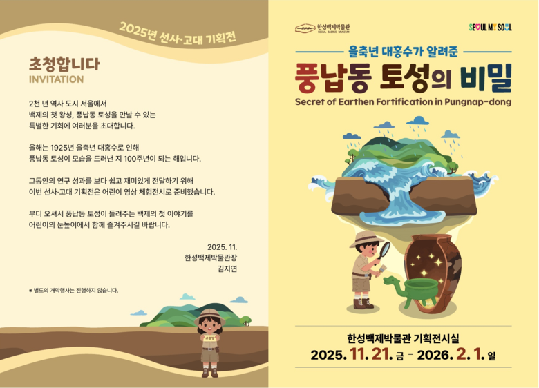 - 11월 21일(금)부터 내년 2월 1일(일)까지 한성백제박물관에서 무료 관람 [서울 세계타임즈=이장성 기자] 한성백제박물관(관장 김지연)은 11월 21일(금)부터 2026년 2월 1일(일)까지 백제의 왕성, 풍납동 토성의 100년 간의 발굴 성과와 의미를 살펴보는 선사·고대 기획전 ‘을축년 대홍수가 알려준 풍납동 토성의 비밀’을 개최한다.