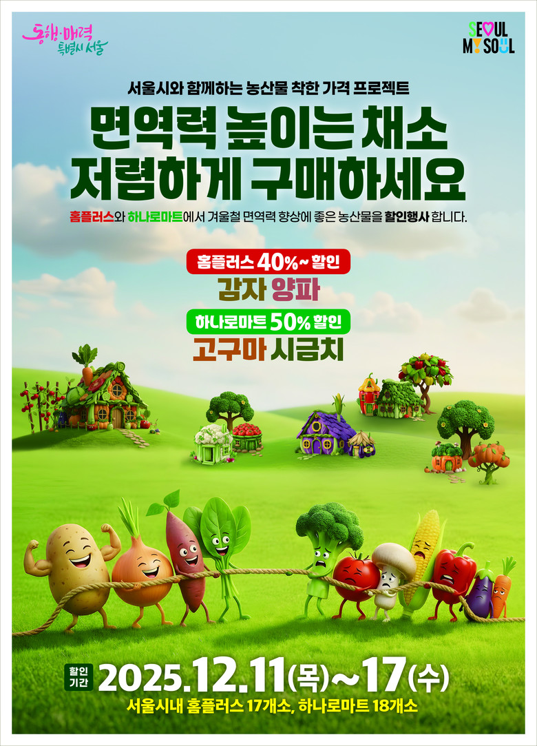 김명선 서울시 공정경제과장은 “이번 행사는 올해 마지막 물가 안정 추진 행사로, 시민들이 일상에서 자주 찾는 농산물을 부담 없이 준비할 수 있도록 구성했다”며, “서울시는 앞으로도 시민 밥상 물가를 지키기 위한 실효성 있는 정책과 지원을 지속해 나가겠다”고 말했다.