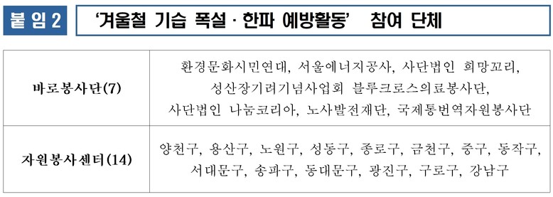 송창훈 서울시자원봉사센터장은 “기습 폭설과 한파는 예측하기 어렵고, 적절히 대처할 시간이 부족해 취약계층에게는 더 큰 피해로 이어질 수 있다”며, “이번 활동이 폭설·한파 취약 계층의 안부를 확인하고 안전하고 건강하게 겨울을 나는 데 도움이 되기를 희망한다”라고 전했다.