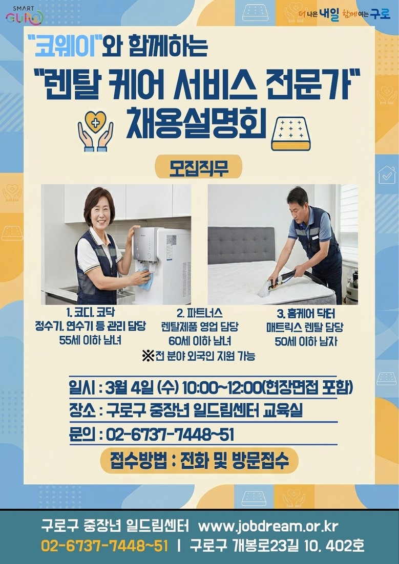 행사는 관내 기업인 코웨이와 협력해 진행되며, 렌탈 케어 서비스 분야 20명을 모집한다. 채용 직무는 코디·코닥, 파트너스, 홈케어 닥터로 구성된다.