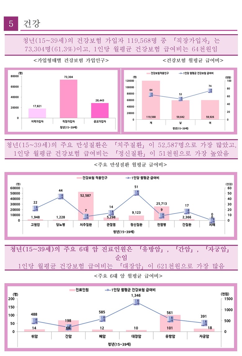지역 청년 중 건강보험 가입자는 총 11만 9,568명으로, 형태별로 직장가입자 7만 3,304명, 공무원·교직원 가입자 2만 8,443명, 지역가입자 1만 7,821명 등이었다.