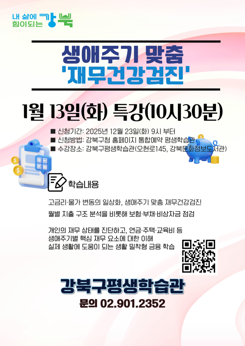 이번에 운영되는 ‘생애주기 맞춤 재무건강검진’ 과정은 1월 13일(화) 오전 10시 30분부터 12시까지 강북구 평생학습관에서 진행될 예정이다. 월별 지출 구조 분석을 비롯해 보험·부채·비상자금 점검을 통해 개인의 재무 상태를 진단하고, 연금·주택·교육비 등 생애주기별 핵심 재무 요소에 대한 이해를 돕는 내용으로 구성됐다.