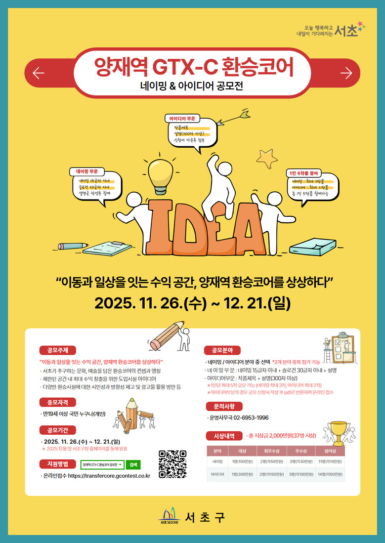 ‘이동과 일상을 잇는 수익 공간’을 주제로 한 이번 공모전에서는 양재역 GTX-C 환승코어의 정체성을 담은 명칭과 실제 적용 가능한 수익시설·서비스 등에 대한 아이디어 공모에 나서게 될 예정이다. 구는 시민들이 직접 참여하는 아이디어 발굴을 통해 GTX-C 환승코어가 환승 기능과 함께 지역 경제와 생활 동선을 아우르는 교통·문화 거점으로 발전할 것으로 기대하고 있다.