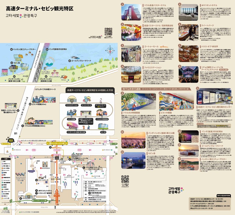 이외에도 ‘고터·세빛 관광특구 안내지도’를 추가 제작해 날씨와 상관없이 안전하게 고투몰(G2번 출구)에서 반포한강공원으로 이동할 수 있는 지하 공공보행통로 위치 등 현장에서 바로 파악하기 쉬운 세부 정보를 담았다. 특구를 방문하는 일본인 관광객의 비율이 높아 기존 국·영문 버전에 일문을 추가한 국·영·일문 3개 언어 버전으로 제작해 여행자가 더 쉽고 알차게 관광을 즐길 수 있을 것으로 보인다. 제작된 지도는 구청 홈페이지에 공개하고 서울시 소재 관광안내센터 8개소에도 비치했다.