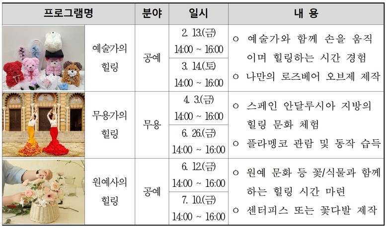 [강남구 세계타임즈=이장성 기자] 꿈이 모이는 도시, 미래를 그리는 강남구(구청장 조성명)가 2월부터 7월까지 구민의 심리적 안정과 감각 회복을 돕는 ‘힐링 원데이 특강’을 강남힐링센터(개포)에서 운영한다. 예술가·무용가·원예사 등 분야별 전문가와 함께 손과 몸을 움직이며 몰입하는 수업으로, 일상 속 긴장을 풀고 회복의 시간을 갖도록 기획했다.