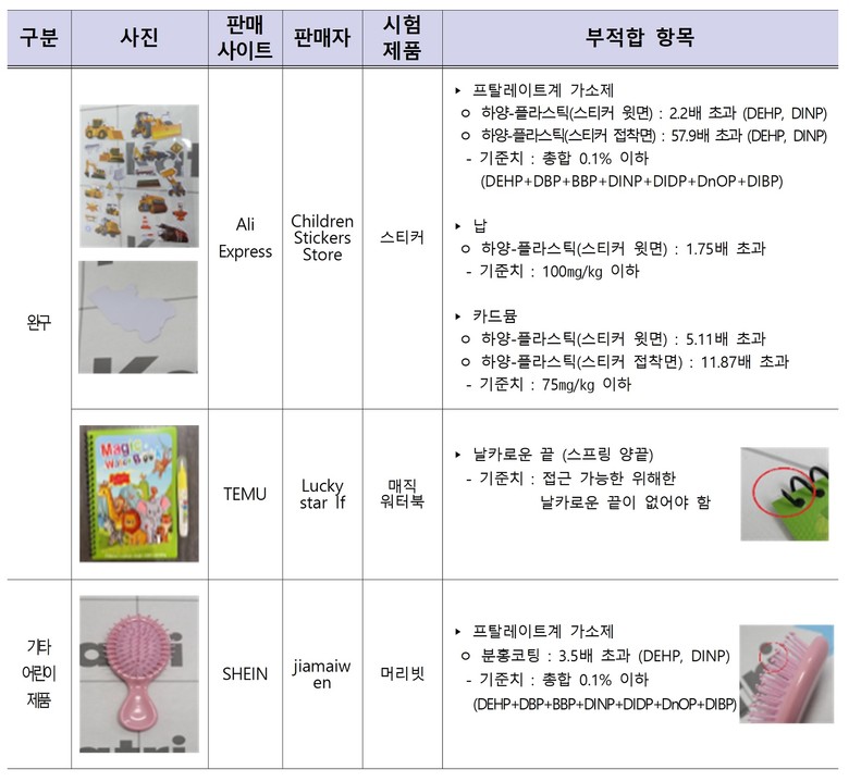 ‘어린이 완구 및 기타 제품’에서도 유해물질이 검출되거나 물리적 안전기준을 충족하지 못했다. 스티커는 원단과 접착면에서 프탈레이트계 가소제가 기준치의 최대 58배, 납은 기준치의 1.7배, 카드뮴은 기준치(75mg/kg 이하)의 최대 12배 초과 검출됐다. 머리빗의 경우 빗살 끝의 볼팁에서 프탈레이트계 가소제가 기준치의 최대 3.5배 초과 검출되었다. 두 제품은 피부에 직접 닿는 만큼 유해물질에 각별한 주의가 필요하다. 마지막으로 매직워터북은 스프링 양 끝이 날카로워 상해의 위험이 있었다.