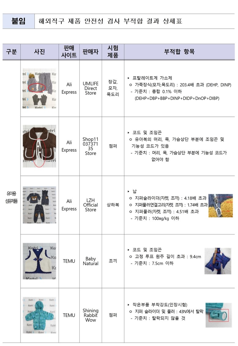 이번 검사는 알리익스프레스‧테무‧쉬인에서 판매 중인 어린이 겨울의류.잡화 15개 제품, 초저가 어린이제품 9개 제품을 대상으로 유해 화학물질 검출, 내구성(기계적‧물리적 특성) 항목을 검사했다.