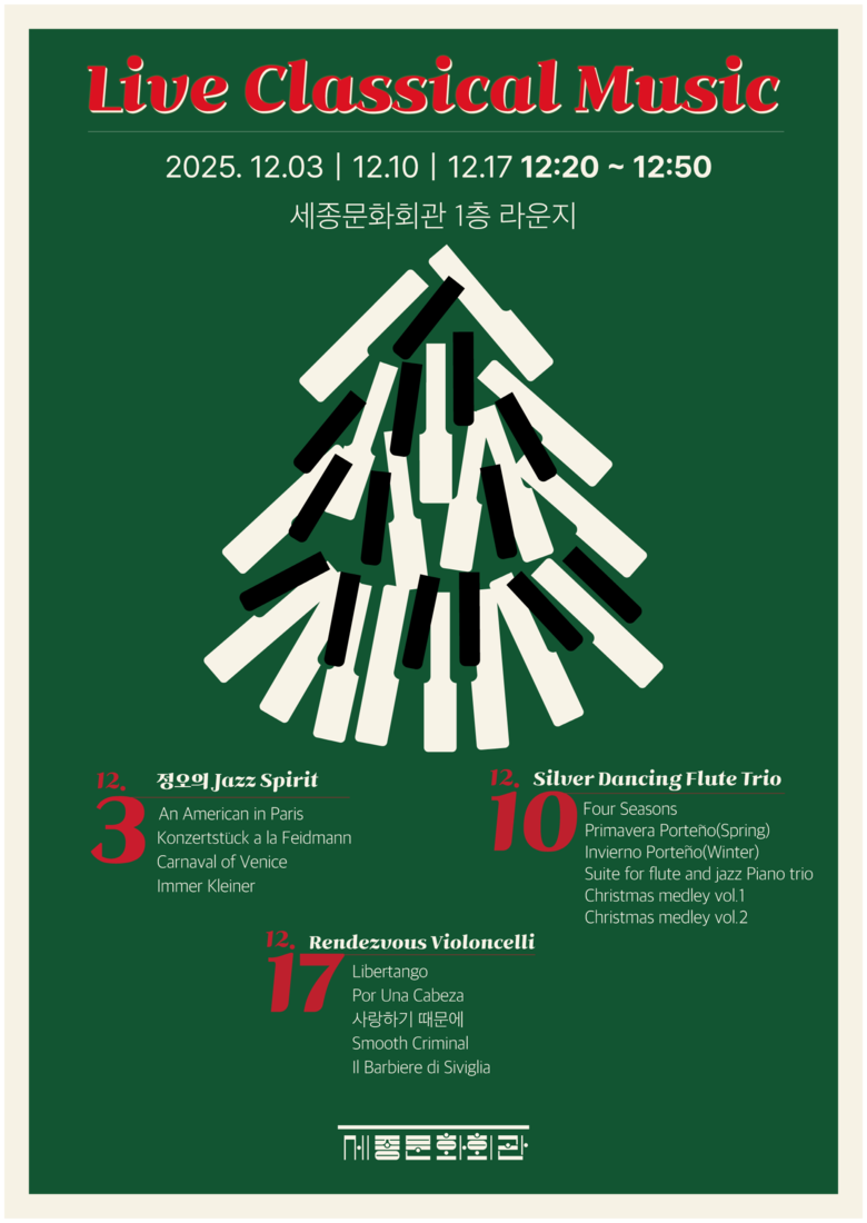 새로운 예술 플랫폼 ‘세종라운지’에서 진행되는 <수요라운지음악회>는 오는 12월, 점심시간을 활용해 특별한 연주를 선보인다. 12월 3일 첫 무대는 ‘정오의 Jazz Spirit’로, 김우연(클라리넷)과 문재원(피아노)이 거슈윈의 「아메리카 인 파리」, 슈라이너의 「임머 클라이너」 등 감각적인 레퍼토리를 들려준다. 10일 두 번째 공연에서는 ‘Silver Dancing Flute Trio’가 무대에 오른다. 정예찬(피아노), 변상훈(플루트), 채태웅(첼로)이 피아졸라 「Four Seasons 중 Spring·Winter」, 크리스마스 메들리 등 활기 넘치는 연주를 선사한다. 17일 마지막 무대는 4첼로 앙상블로 꾸며지며, 홍채원·조윤서·조이한·채지웅 첼리스트가 탱고부터 대중음악, 팝까지 다양한 장르의 곡으로 첼로의 매력을 전하며 연말 분위기를 뜨겁게 달굴 예정이다.
