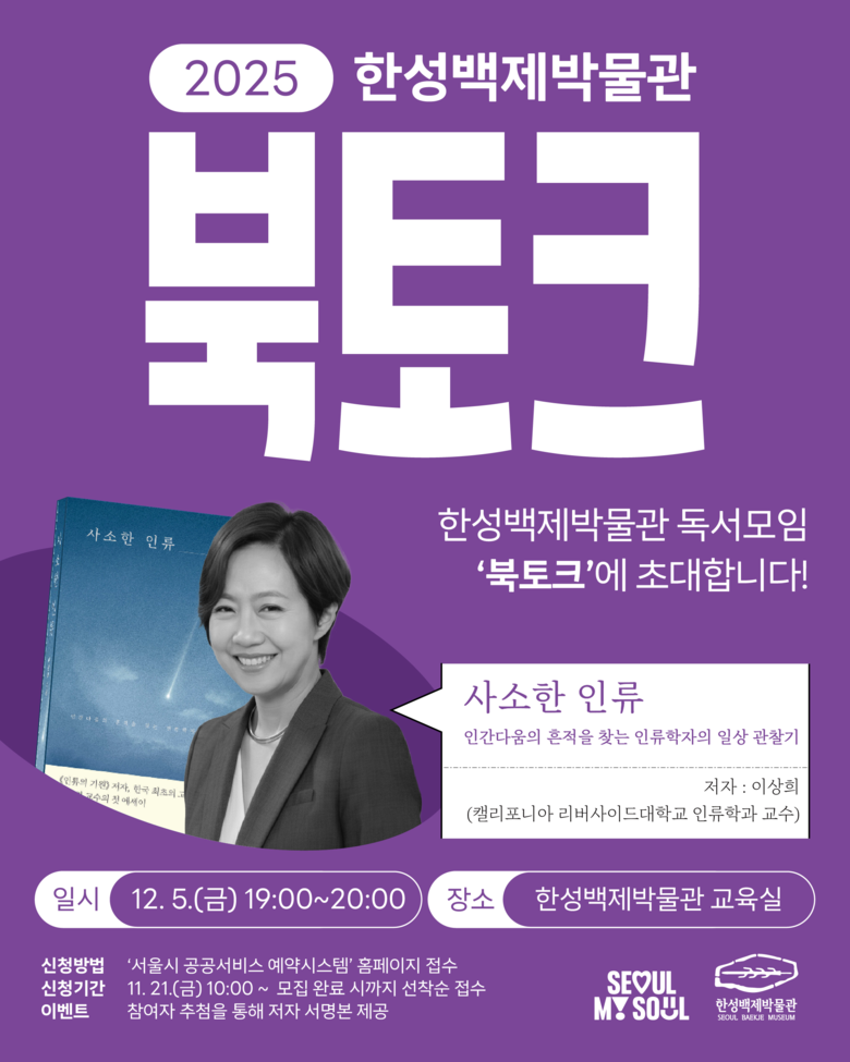 한성백제박물관 북토크의 참가비는 무료이며 서울시 공공서비스예약 누리집을 통해 선착순으로 45명의 모집한다. 참석자들에게는 추첨을 통해 저자 서명이 담긴 도서를 증정하는 이벤트도 마련됐다. 행사와 관련된 자세한 내용은 한성백제박물관 누리집(baekjemuseum.seoul.go.kr)을 확인하면 된다.