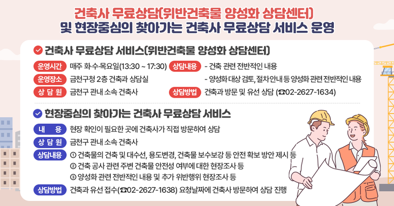 건축사 무료 상담 서비스는 금천구 관내 소속 건축사가 건축 전반에 대한 전문적인 상담과 위반건축물 양성화 관련 상담을 제공한다.