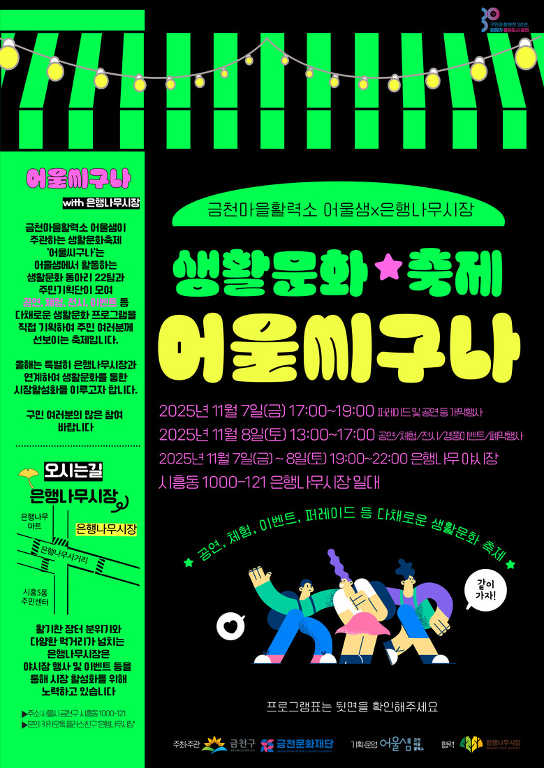 이번 행사는 주민 누구나 예술가가 되어 동아리 활동과 프로그램을 기획하고 참여할 수 있는 생활문화공간 ‘금천마을활력소 어울샘(이하 어울샘)’과 전통시장인 ‘은행나무시장’이 협력해 마련됐다. 금천문화재단은 함께 축제를 준비하며 지역 주민 네트워크 기반의 자생적 생활문화 생태계 조성을 목표로 한다.