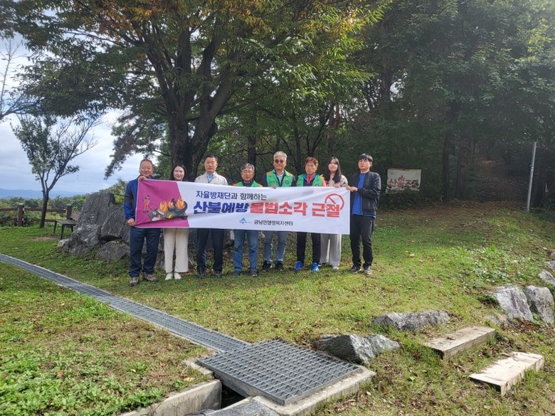 금남면 자율방재단원은 시민을 대상으로 산불 예방수칙을 안내하고 ‘산불 조심’ 현수막을 게재했다.