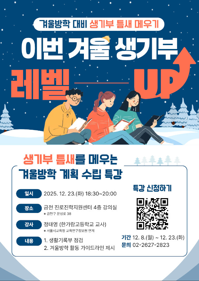 - 정태영 교사 ‘생기부 틈새를 매우는 겨울방학 계획수립 요령’ 주제로 특강 [금천구 세계타임즈=이장성 기자] 금천구(구청장 유성훈)는 오는 12월 23일 오후 6시 30분 겨울방학 동안 학생들이 생활기록부를 체계적으로 점검하고, 맞춤형 학습 전략을 세울 수 있도록 돕기 위한 ‘겨울방학 대비 생활기록부 점검 특강’을 개최한다고 밝혔다.