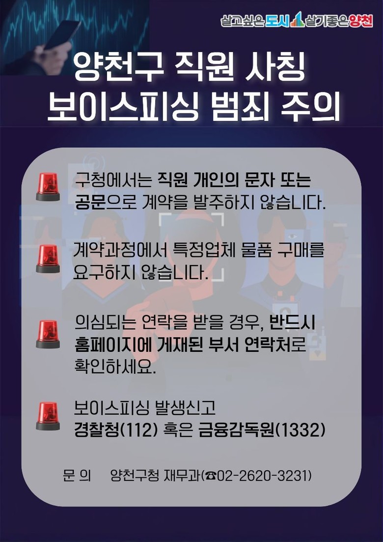 이 밖에 계약과 관련하여 보이스피싱을 포함한 공무원 사칭 관련 사항은 양천구청 재무과(☎02-2620-3231)로 문의하면 된다.