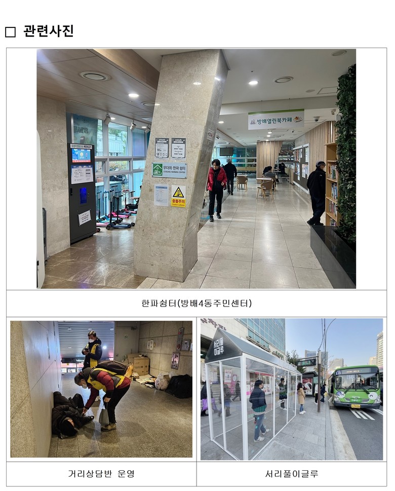‧ (한파쉼터) 동주민센터·경로당 등 62개소 지정·운영, ‘서초구 한파응급대피소’도 마련