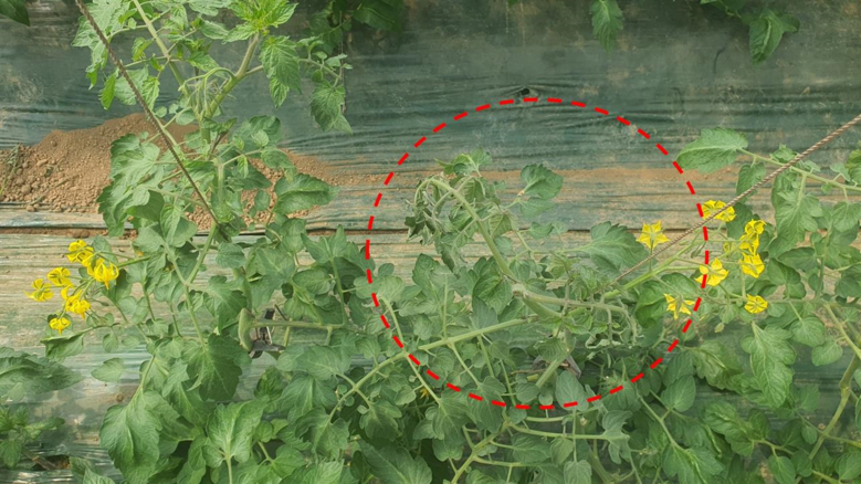| ▲ 토마토 시들음병 증상(원형점선 내) |