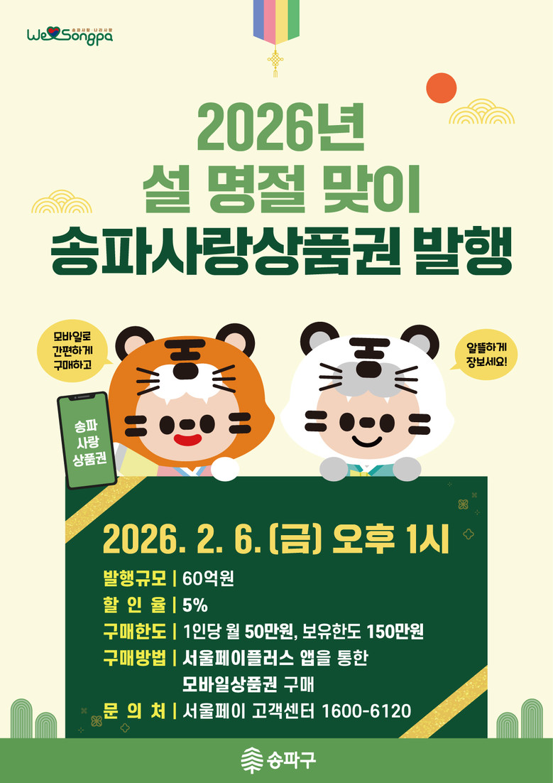 서강석 송파구청장은 “명절을 앞두고, 구민들이 장보기와 외식 등 상황에 맞춰 상품권을 유연하게 활용하실 수 있도록 발행 체계를 세심하게 준비했다”며, “지역 상품권을 통해 위축된 소비심리를 되살리고, 소상공인의 매출 증대로 이어져 지역사회 경제 선순환에 도움이 되길 바란다.”고 전했다.