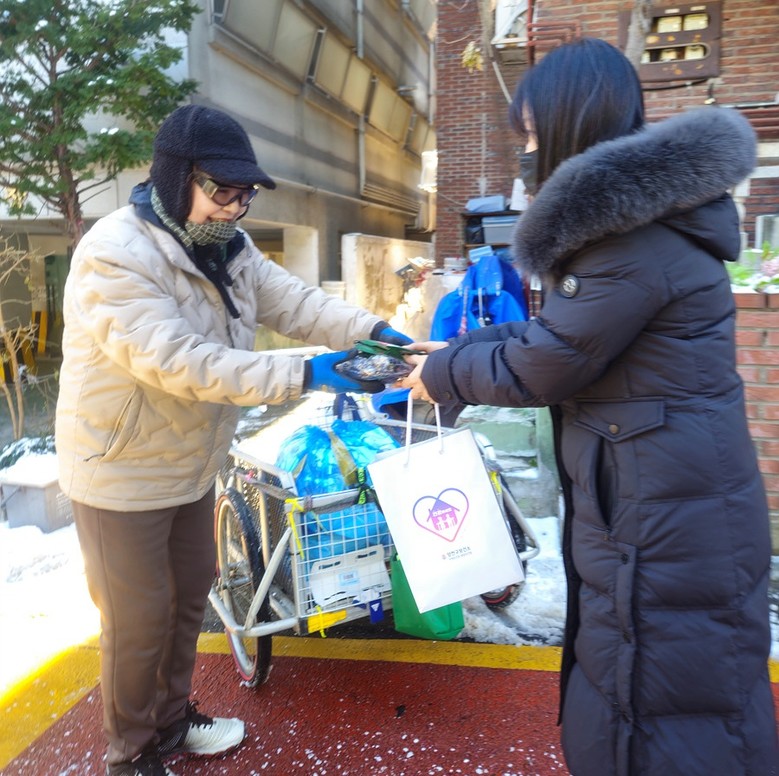 | ▲ 폐지 수집 어르신에게 방한용품을 전달하고 있는 모습 |