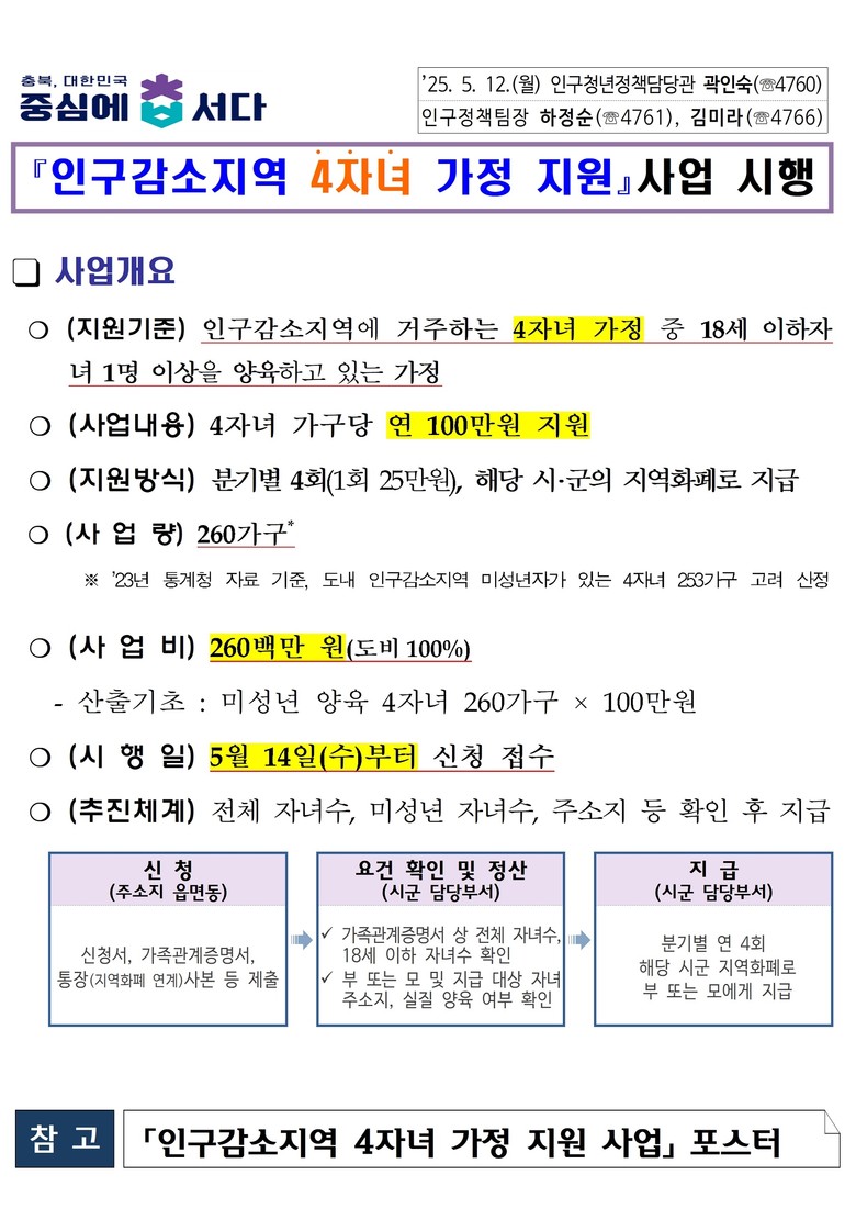 충북도는 지난해 전국 최초로 시행한 ‘초 다자녀 가정 지원사업(5자녀 이상 가정 대상)’에서 한발 더 나아가, 양육 부담이 여전히 큰 4자녀 가정까지 지원 대상을 확대한다.