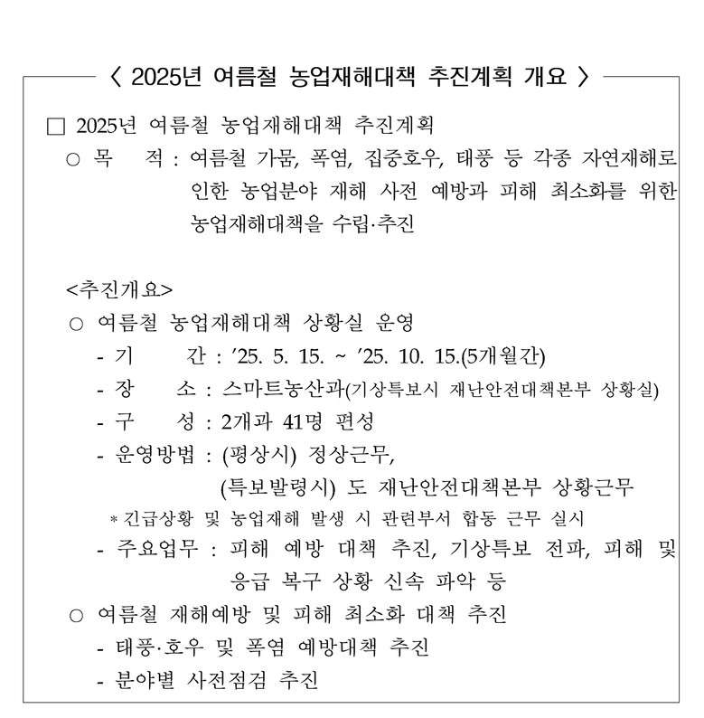 도 스마트농산과는 여름철 기상 전망을 고려하여 농업재해대책상황실을 설치하여 5월 15일부터 10월 15일까지 운영하고, 재해발생 시 신속한 피해 상황 파악 및 응급조치로 피해가 최소화될 수 있도록 하고 기상특보를 신속하게 농업인, 유관기관 등에 전파할 계획이다.