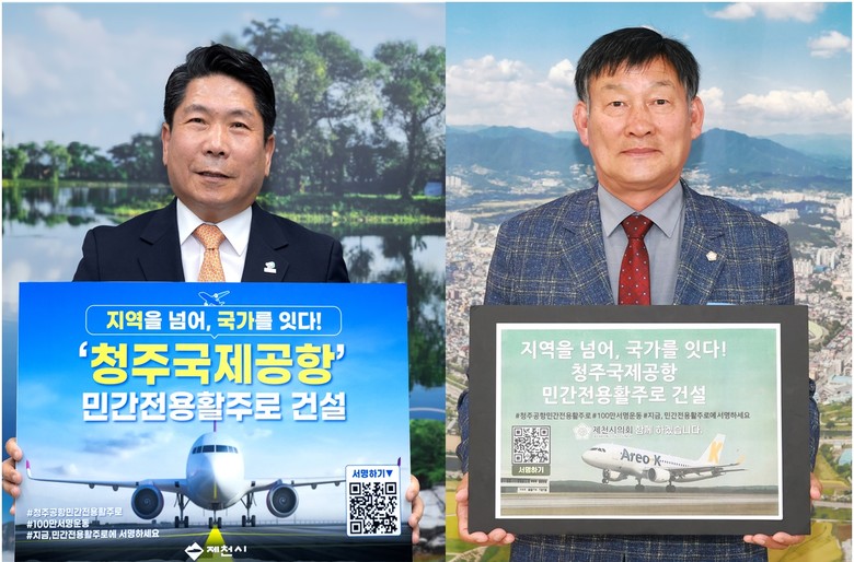 지난 7일 김창규 제천시장과 박영기 제천시의회 의장은 ‘청주공항 민간전용활주로 건설’ 표어를 들고 릴레이 캠페인에 참여하며, “제천의 교통·관광 잠재력을 현실로 만들기 위한 핵심 동력이다”라며 적극적인 지지 의사를 밝혔다.