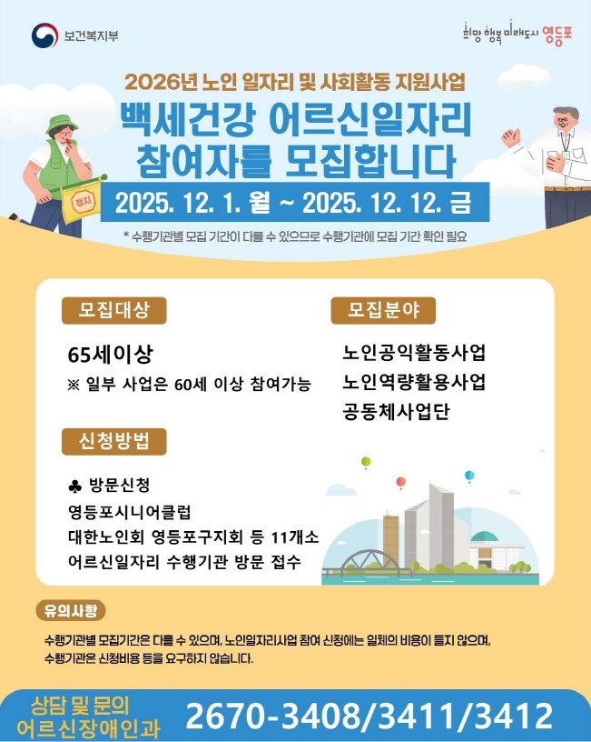 한편, 민간 취업과 연계를 지원하는 취업알선형 사업은 별도의 모집 기간 없이 영등포시니어클럽과 영등포노인종합복지관에서 연중 상담을 받을 수 있다.