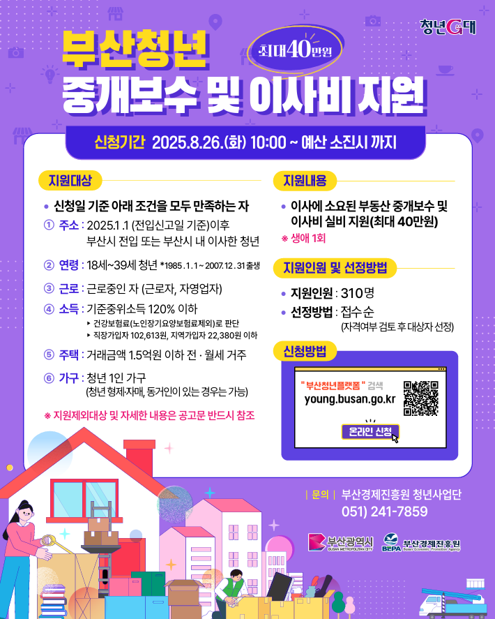 ◈ 8.18. 모집공고, 8.26. 10:00부터 부산청년플랫폼(www.busan.go.kr/young)에서 온라인 신청하면 돼 [부산 세계타임즈=이용우 기자] 부산시(시장 박형준)는 취업 등으로 이동이 잦은 청년의 주거비 부담을 완화하고 안정적인 부산 정착을 돕기 위해 추진하는 「2025 부산청년 중개보수 및 이사비 지원사업」 대상자를 오는 8월 26일부터 310명을 모집한다고 밝혔다.