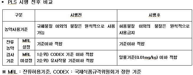 농약허용물질관리제도 즉 PLS란 작물별로 등록된 농약에 한해 일정 기준 내*에에서 사용하도록 하고 잔류허용기준이 없는 농약의 경우 일률적으로 0.01ppm을 적용하는 제도입니다.