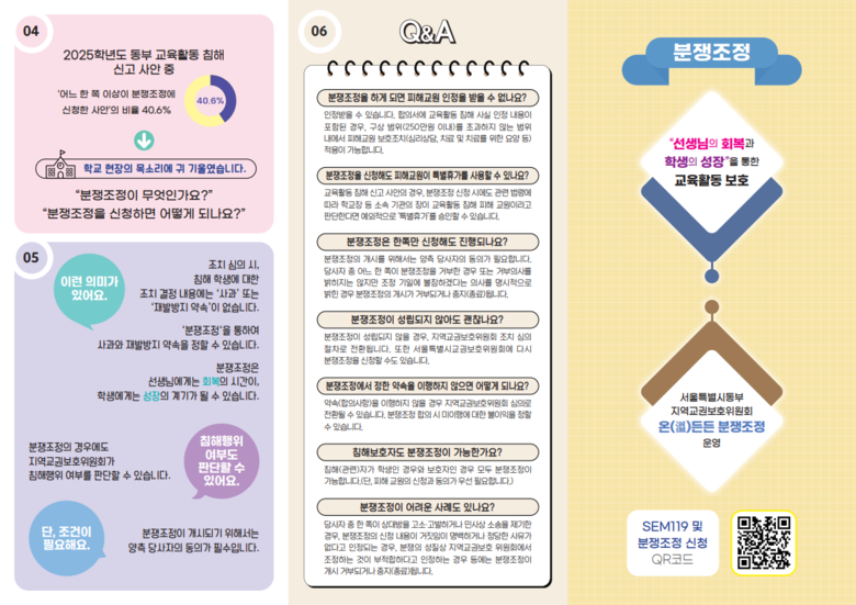 이미경 교육장은 “분쟁조정은 교육활동 침해 사안을 갈등의 종결이 아닌 회복의 출발점으로 전환하는 과정”이라며 “앞으로도 선생님 곁에서 든든히 지원하며, 학생이 성장하는 교육공동체 문화를 만들어 가겠다.”고 밝혔다.
