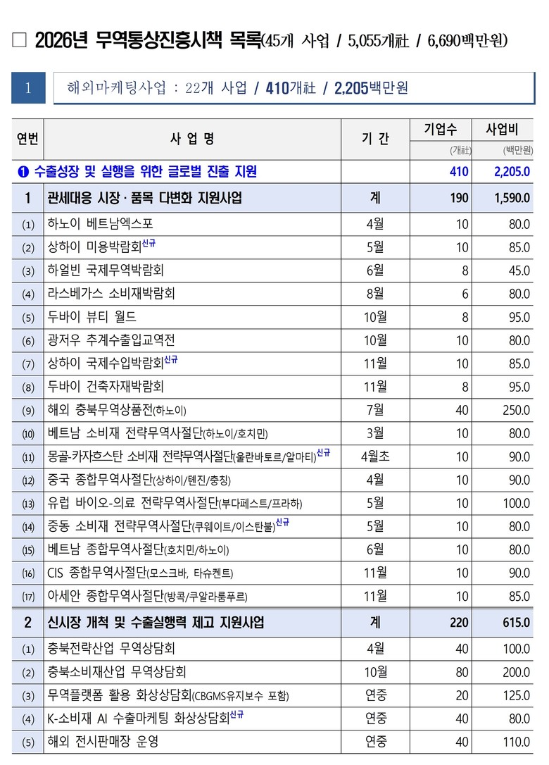 정순지 충북도 국제통상과장은 “2026년은 글로벌 통상 여건이 녹록지 않은 상황이지만, 현장 중심의 무역통상 지원과 전략적 해외마케팅을 통해 도내 수출기업의 경쟁력을 강화하고 안정적인 수출 기반을 구축해 나가겠다”고 밝혔다.