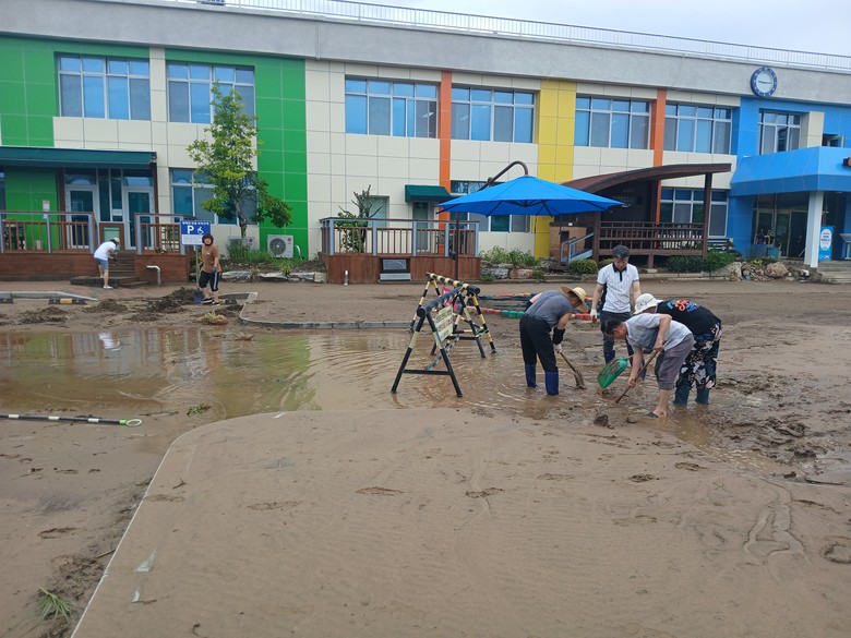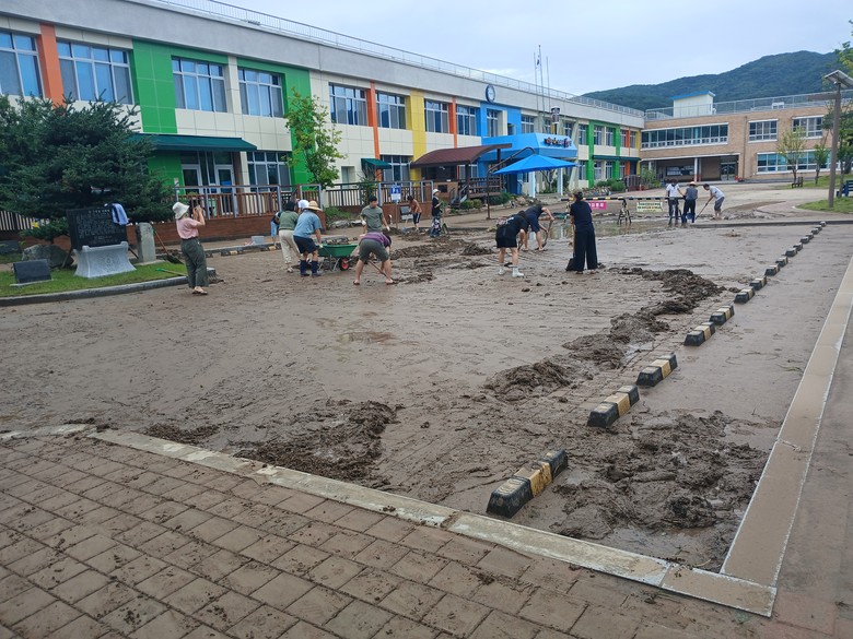 이른 아침부터 시작된 복구작업에 동참한 학부모와 교직원은 갑작스러운 피해에 장화나 삽 등 장비가 부족함에도 흙탕물을 퍼내고, 운동장 곳곳에 쌓인 토사를 쓰레받기로 걷어내며 학생들의 안전한 학습 환경을 마련하는데 전념했다.