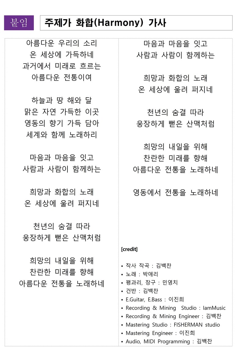 ‘화합(Harmony)’은 국악의 세계화와 전통음악의 현대적 해석을 담아낸 창작 국악곡으로, 국내 최초로 ‘국악’을 주제로 영동에서 개최되는 국악엑스포의 상징성과 의미를 담아, 우리의 소리로 과거와 미래를 잇고 희망과 화합을 이루자는 메시지를 전하는 곡이다.