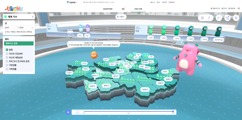 행복지수, 우리 동네 만족도 등에 대한 3차원 시각화 자료는 서울데이터허브 누리집(http://data.seoul.go.kr/bsp)에서 확인할 수 있다.