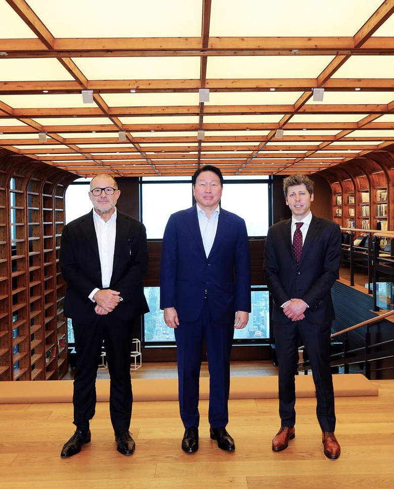 | ▲최태원 SK 그룹 회장(가운데)과 샘 올트먼 OpenAI CEO(오른쪽), 조나단 아이브 OpenAI 크리에이티브 헤드 (Creative Head) (왼쪽)가 1일 서울 종로구 SK서린빌딩에서 기념 촬영을 하고 있다.(사진=SK하이닉스) |