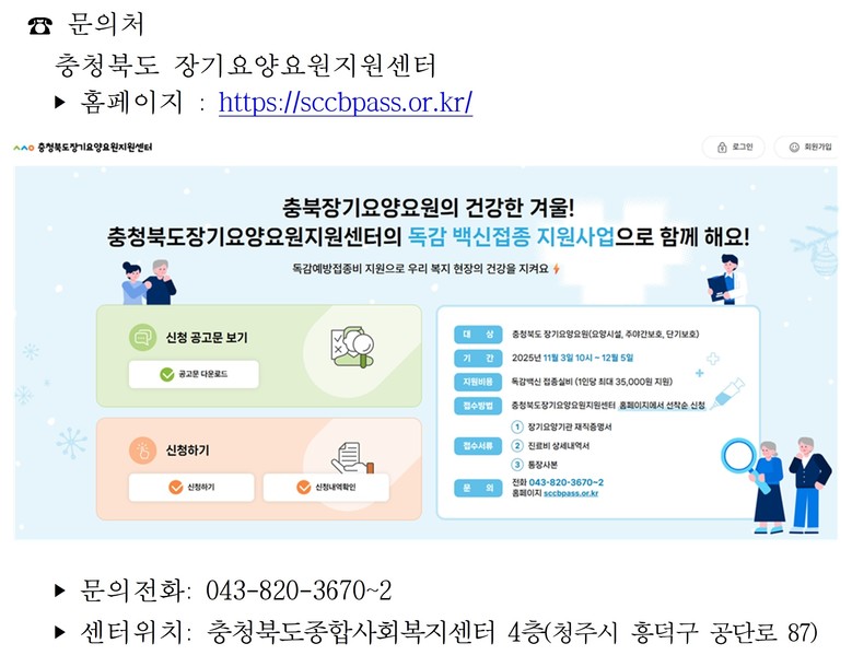 한편, 이번 장기요양요원 독감백신 접종 지원사업은 지난 9월 충청북도 장기요양요원지원센터 개소 이후 첫 지원사업으로, 향후 안전한 돌봄환경 조성을 위하여 다양한 건강관리 프로그램으로 확대 운영될 예정이다.