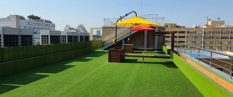 서관 옥상 하늘정원은 인조잔디와 나무 데크로 구성된 바닥 위에, 자연스러운 동선을 따라 나무 울타리와 화분을 배치했다. 상록수와 계절의 변화를 담은 초화류를 식재하여, 사계절 내내 초록의 온기를 느낄 수 있도록 했다.